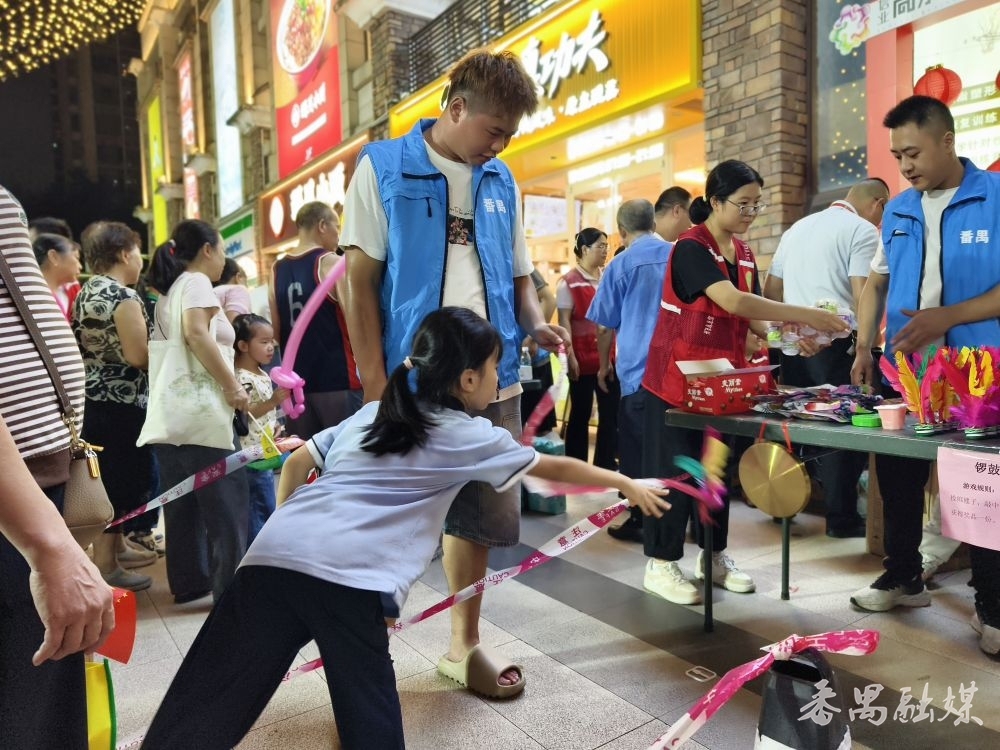 当晚,尚东汇广场一片热闹景象。“巧送‘月饼’回家”“趣味投壶”“百发百中”等游戏摊位前人头攒动,亲子家庭、长者与特殊群体踊跃参与,欢笑声此起彼伏。政策宣传区内,志愿者一边发放困境儿童服务手册,一边普及帮扶政策;“星星之友”队员则耐心陪伴特殊群体,引导他们参与游戏,帮助他们融入现场欢乐氛围。